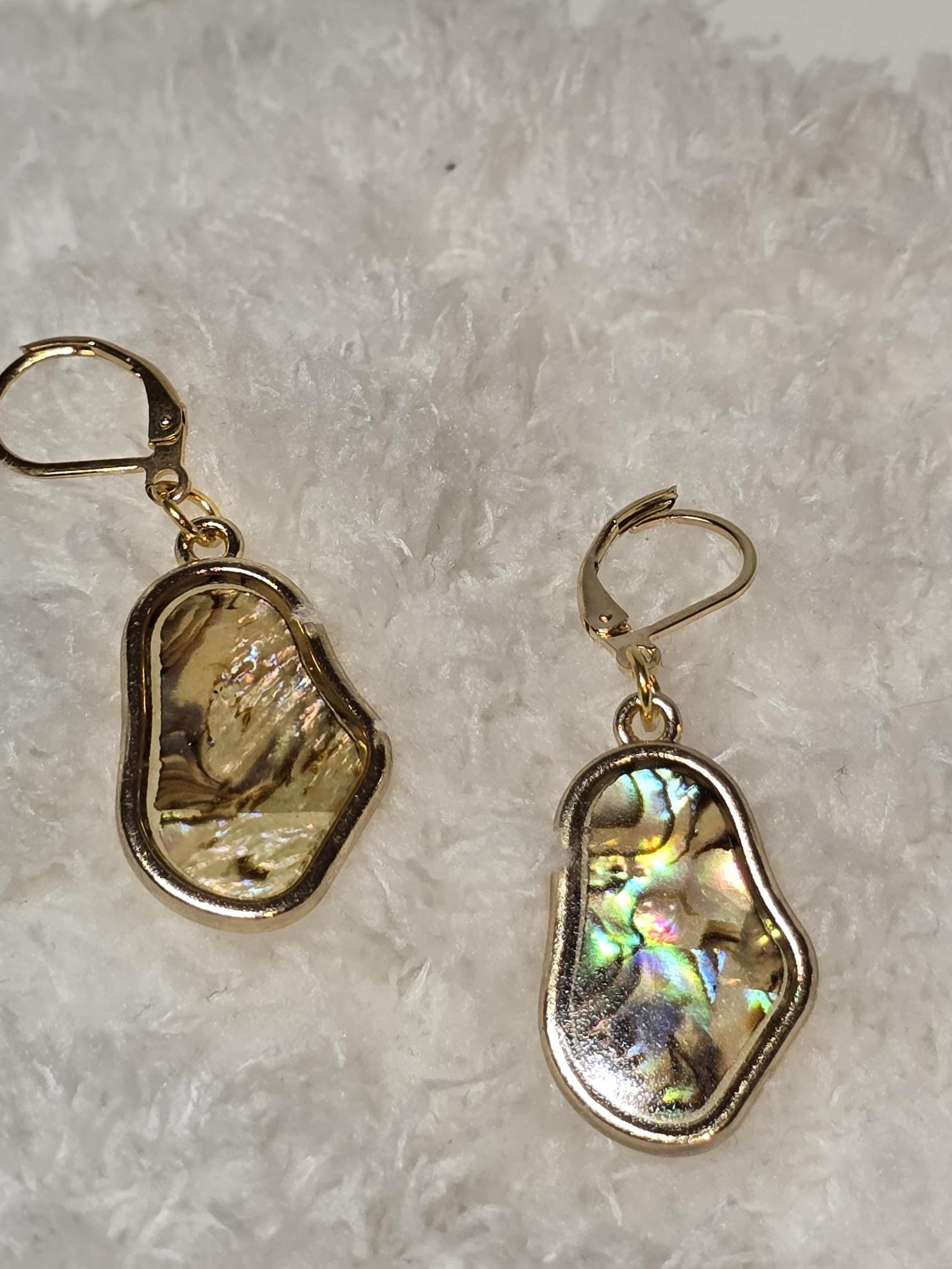 Gold-framed abalone shell earrings featuring natural iridescent shimmer.