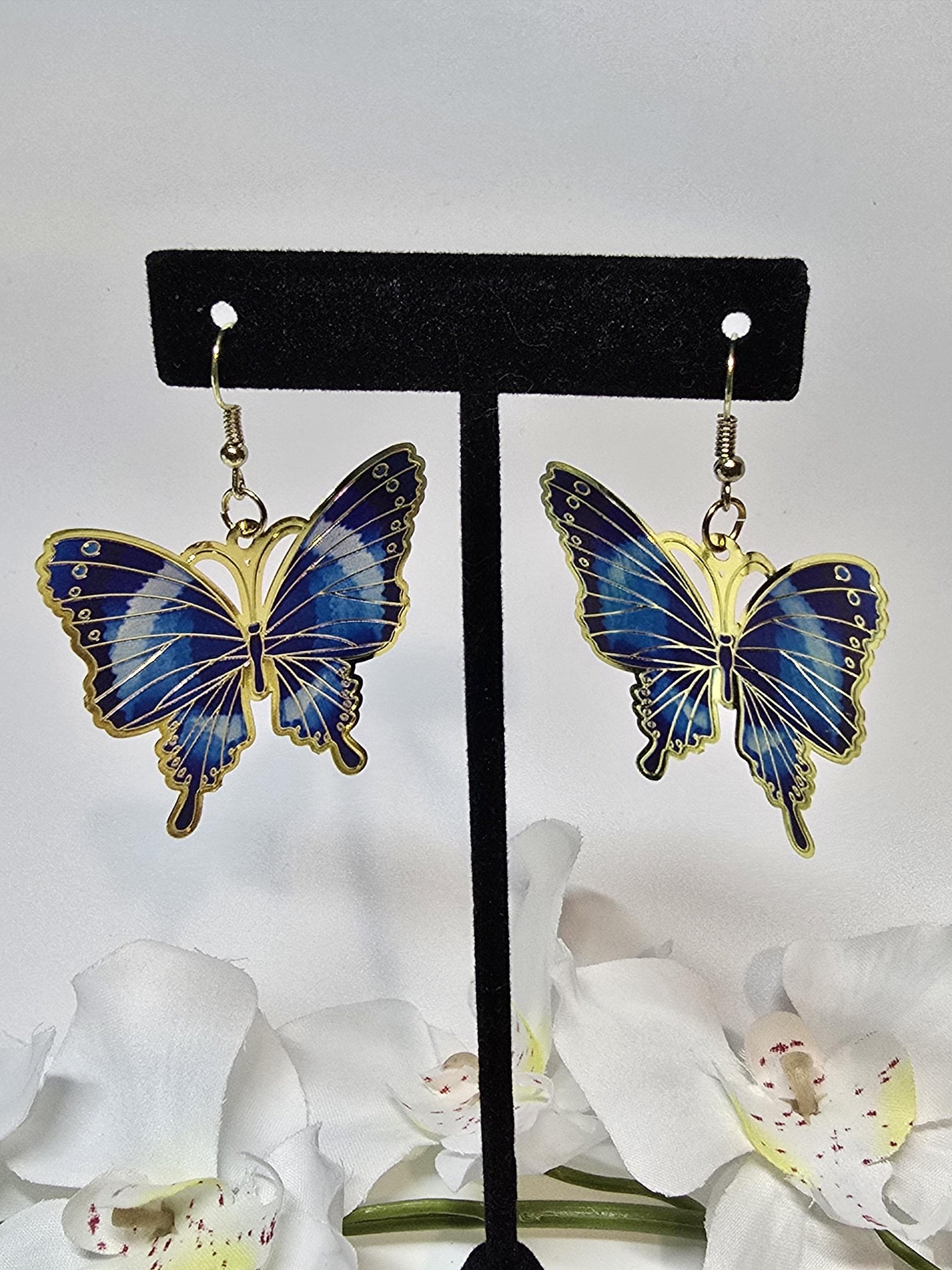 Blue Butterfly Earrings, Bold Enamel Statement Earrings, Colorful Gold Trim Jewelry
