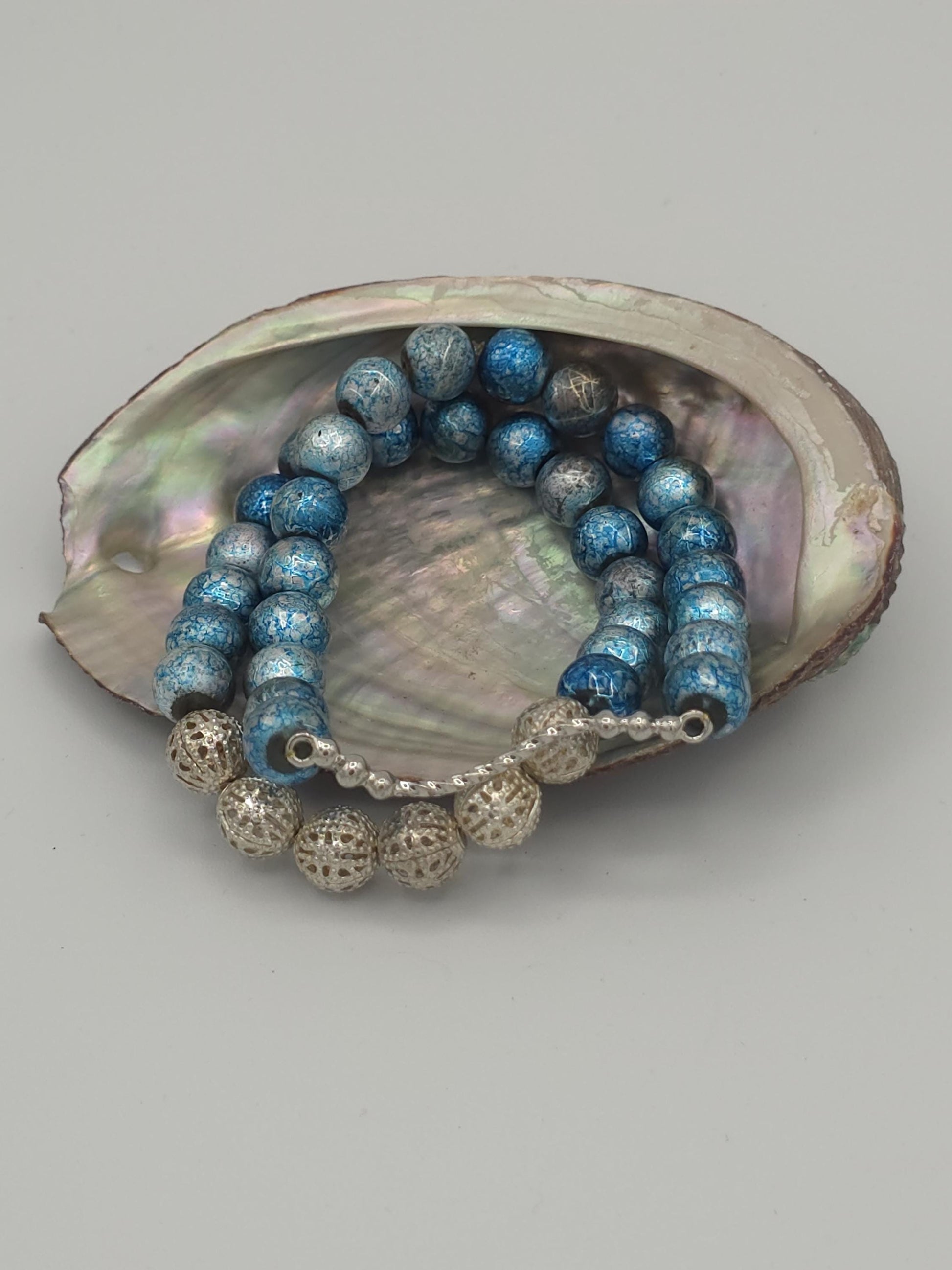 Blue Marble Beaded Bracelet with Silver Filigree | Handmade Stretch Bracelet