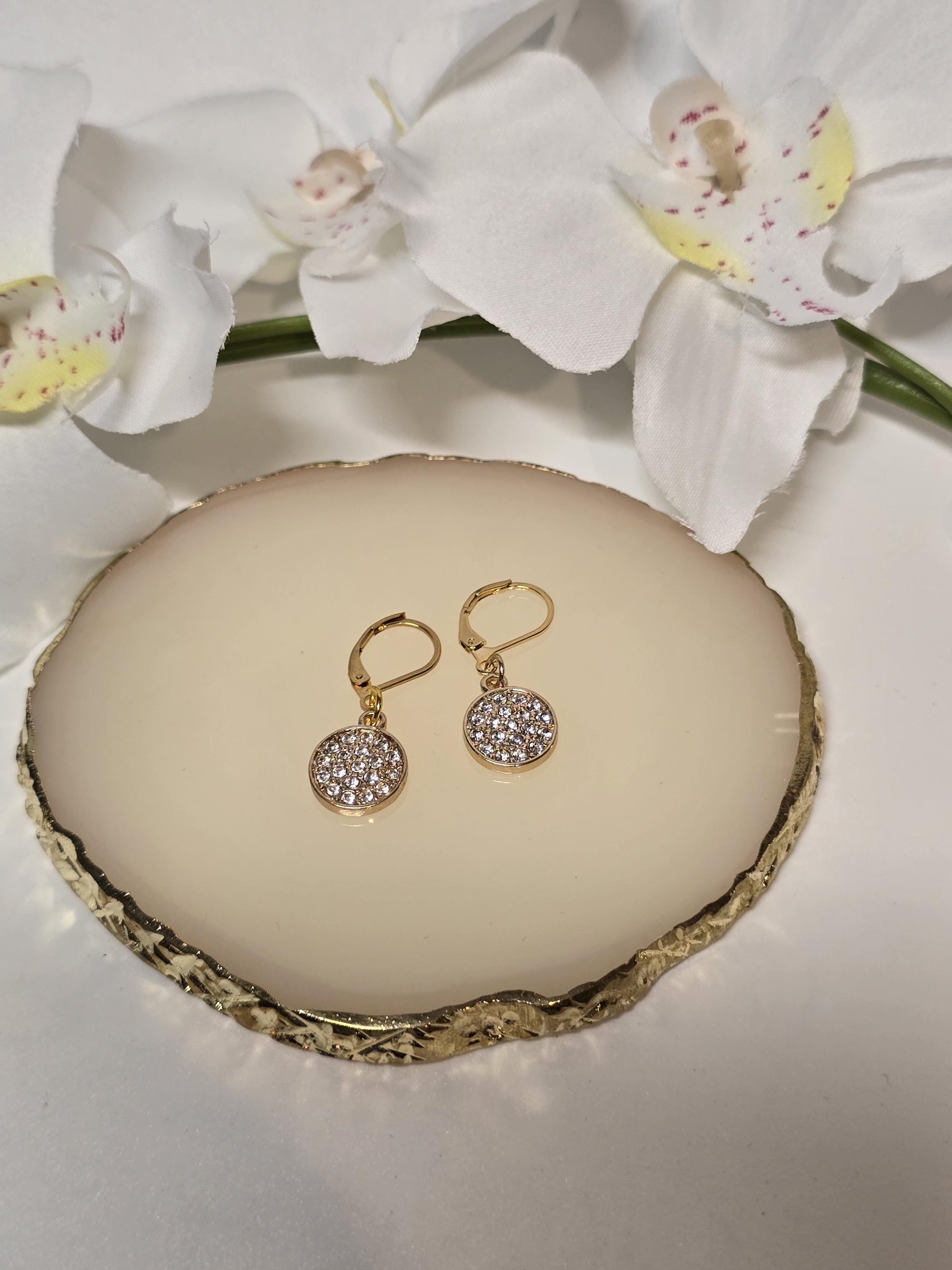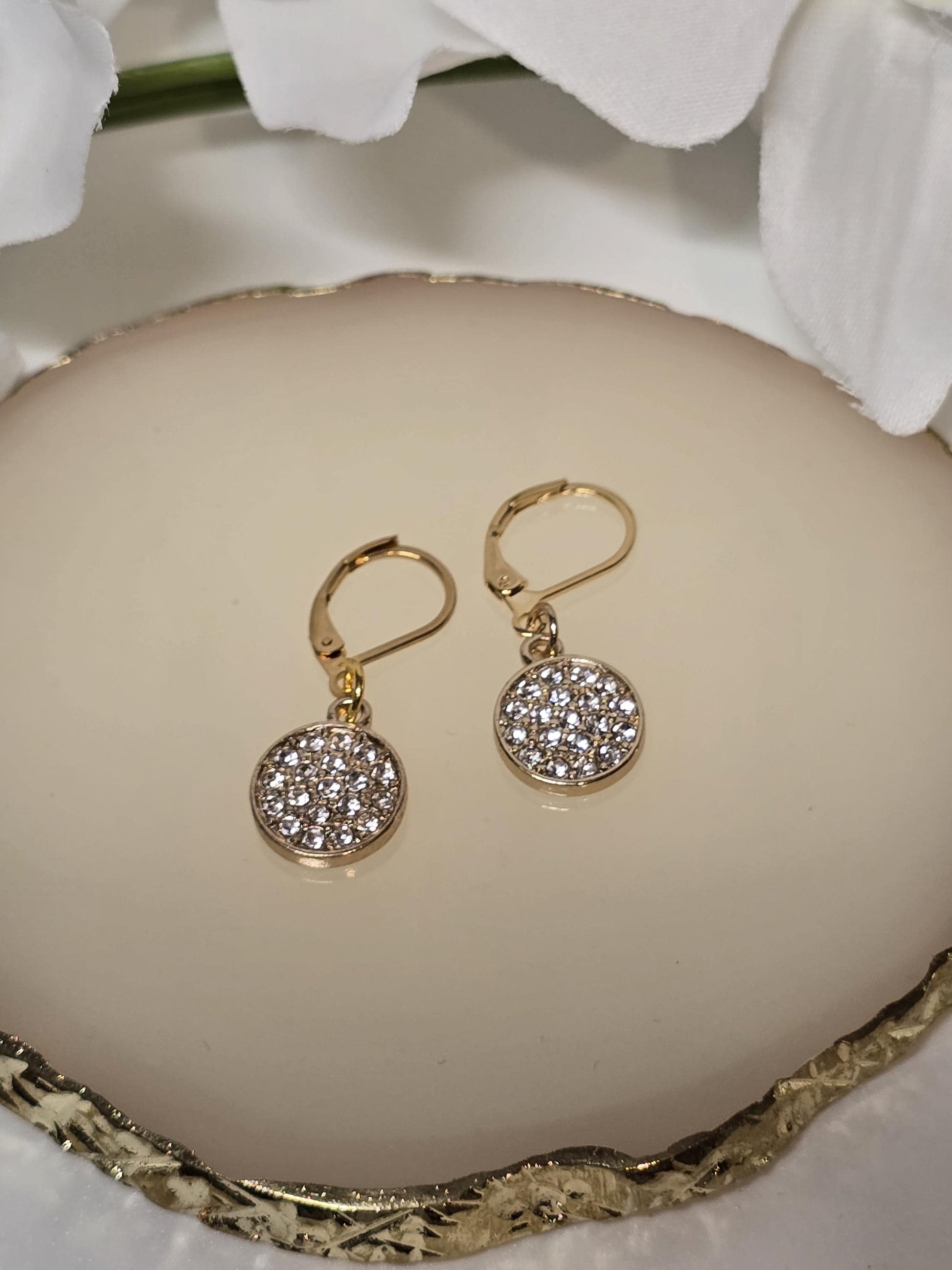 A refined touch of sparkle. These gold leverback earrings feature a crystal-studded disc that catches the light without overpowering your look.