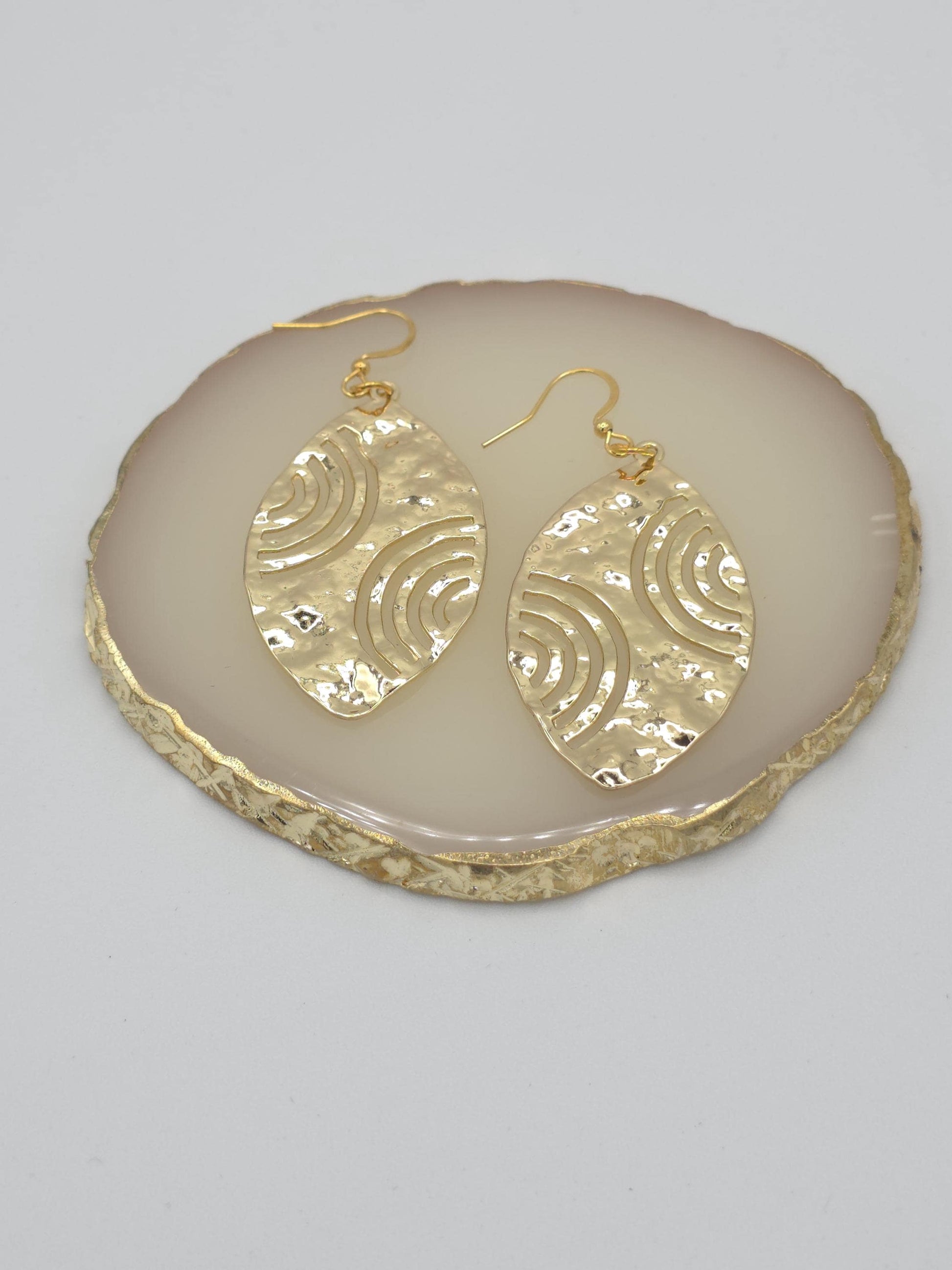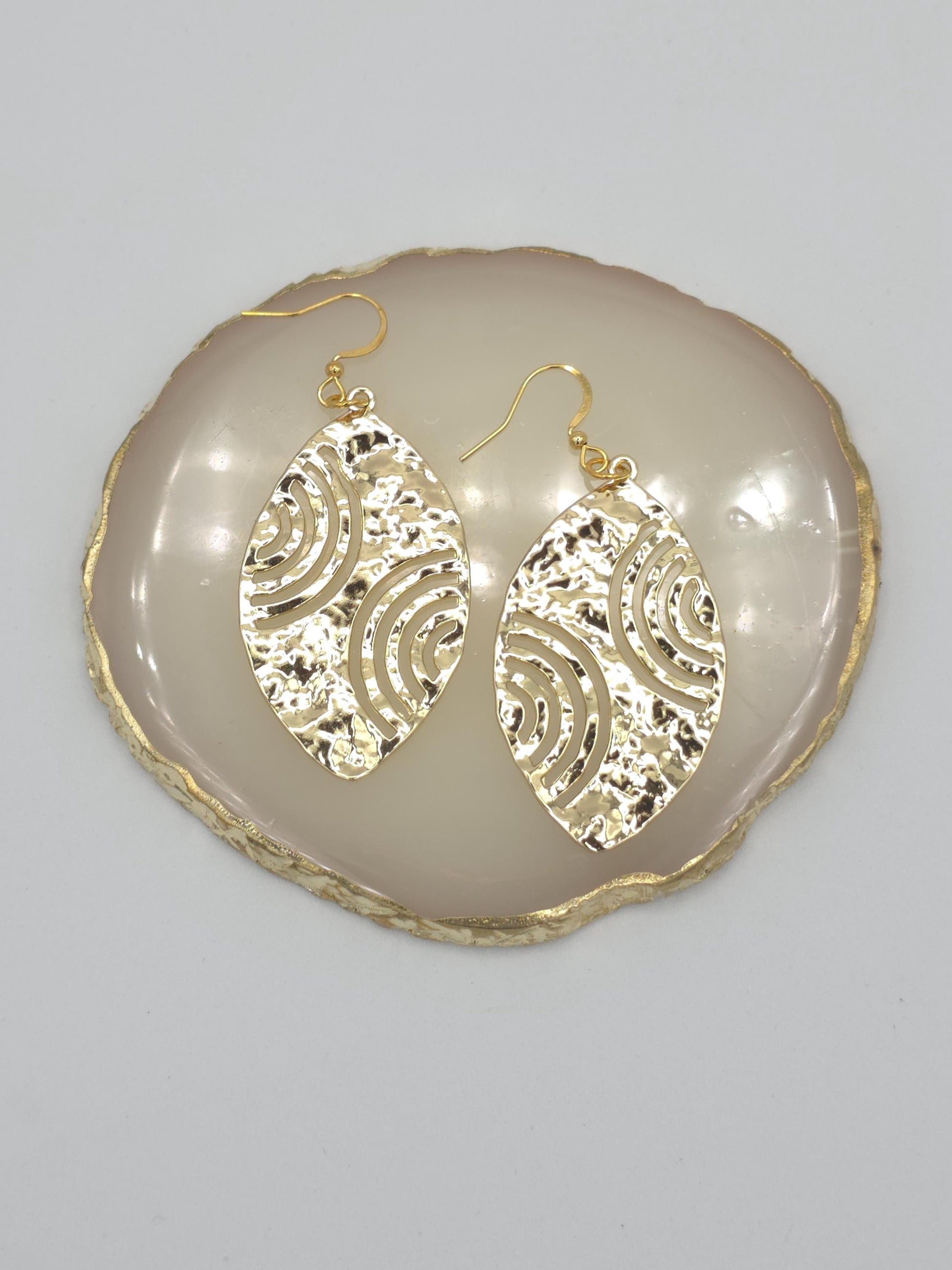 These gold patterned oval earrings feature a bold textured design that stands out effortlessly. Lightweight yet striking, perfect for elevating any outfit from casual to chic.