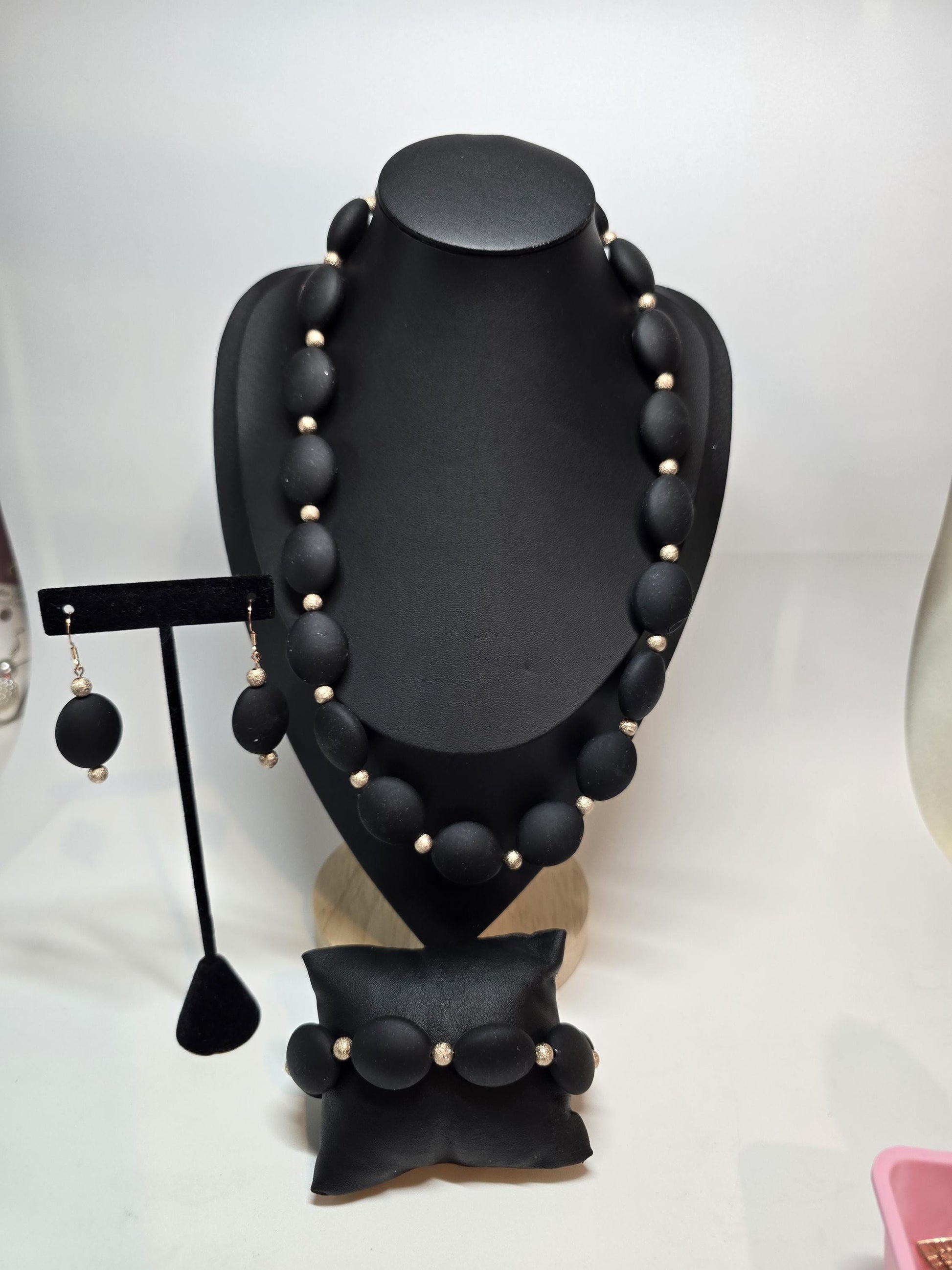 Matte Black Beaded Jewelry Set, Gold Accent, Statement Necklace, Bracelet & Earrings