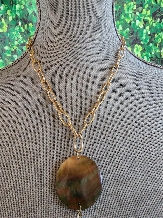 This bold Mother of Pearl disc necklace features a natural shell pendant with luminous iridescent tones and a dramatic gold tassel accent. Each piece reflects subtle greens, silvers, and soft pink hues that shift beautifully in the light.