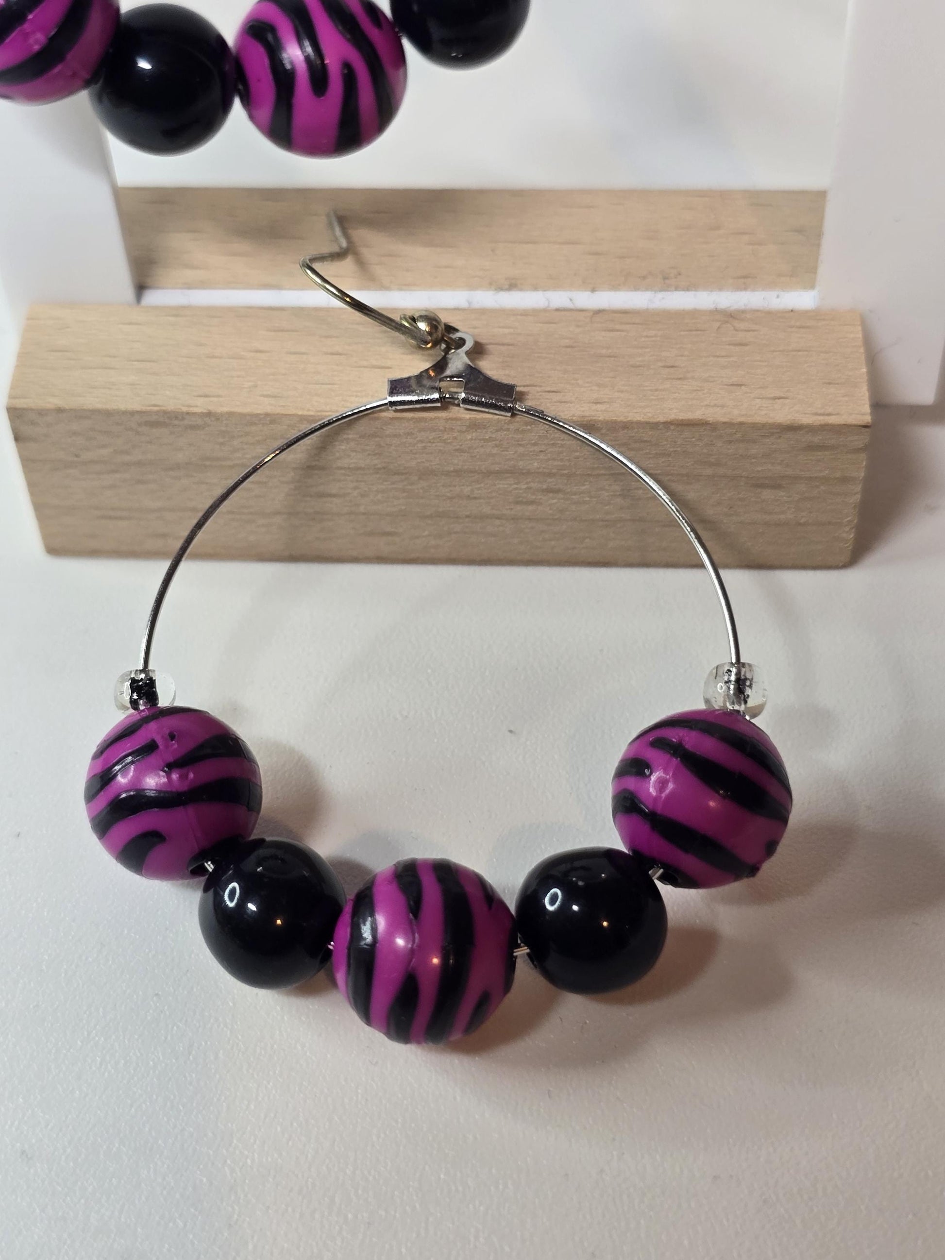 Make a bold statement with these eye-catching pink and black zebra-pattern bead hoop earrings. Designed for those who love vibrant color and standout accessories, these hoops bring fun energy to any look. Lightweight yet dramatic, they’re perfect for festivals, nights out, or adding flair to everyday wear.