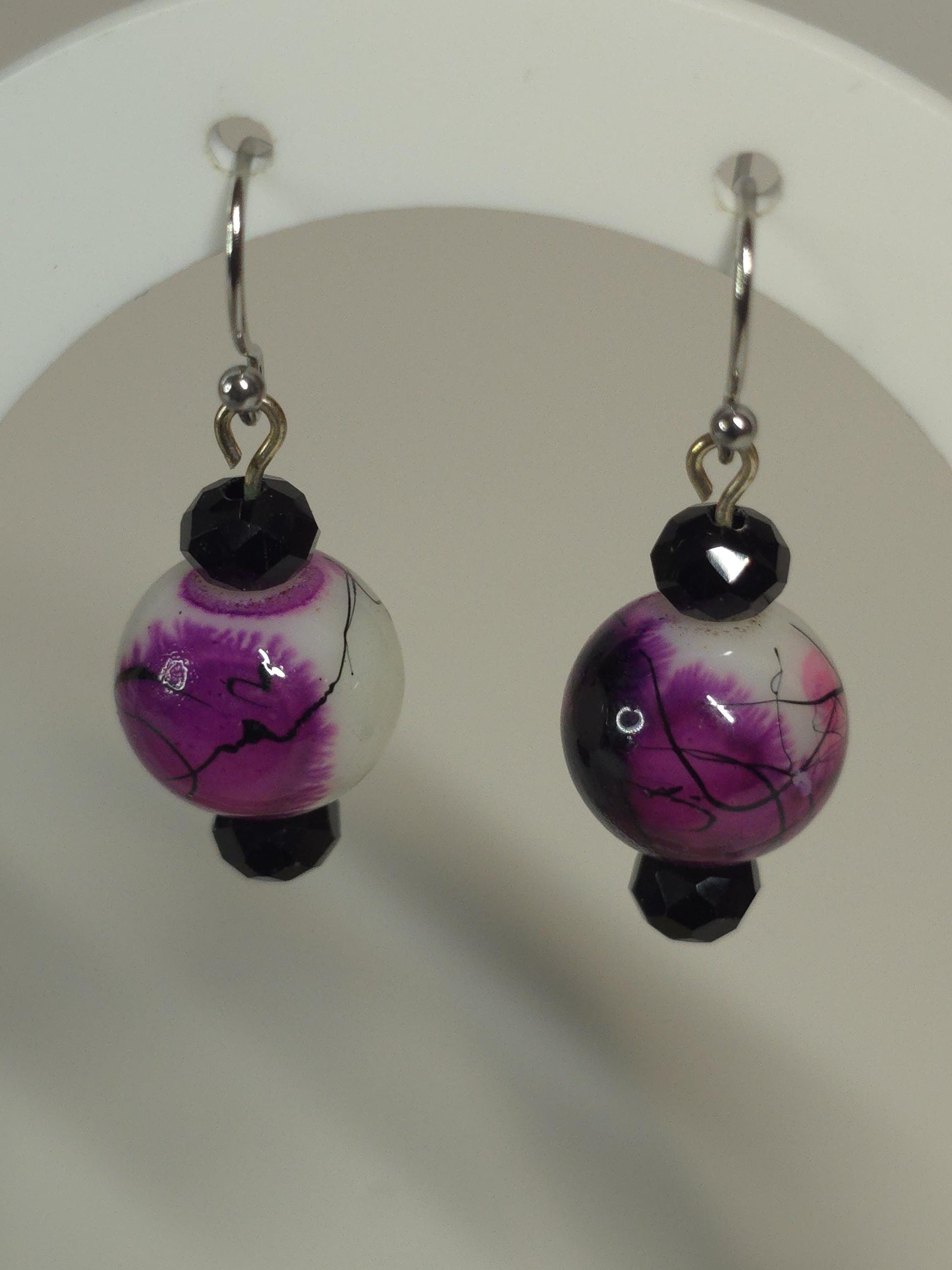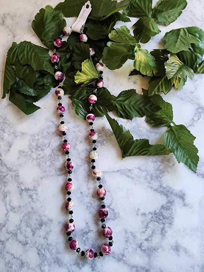 Make a bold yet elegant statement with this handmade purple and white beaded necklace set, designed to stand out while remaining timeless. This one-of-a-kind set features glossy round beads in rich shades of purple and creamy white, accented with black spacer beads for contrast and depth.